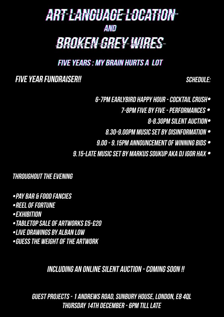 Broken Grey Wires and Art Language Location will join forces this December at Guest Projects in London for a special fundraiser. It is Art Language Location’s five-year anniversary, and what better way to celebrate, than with great friends!