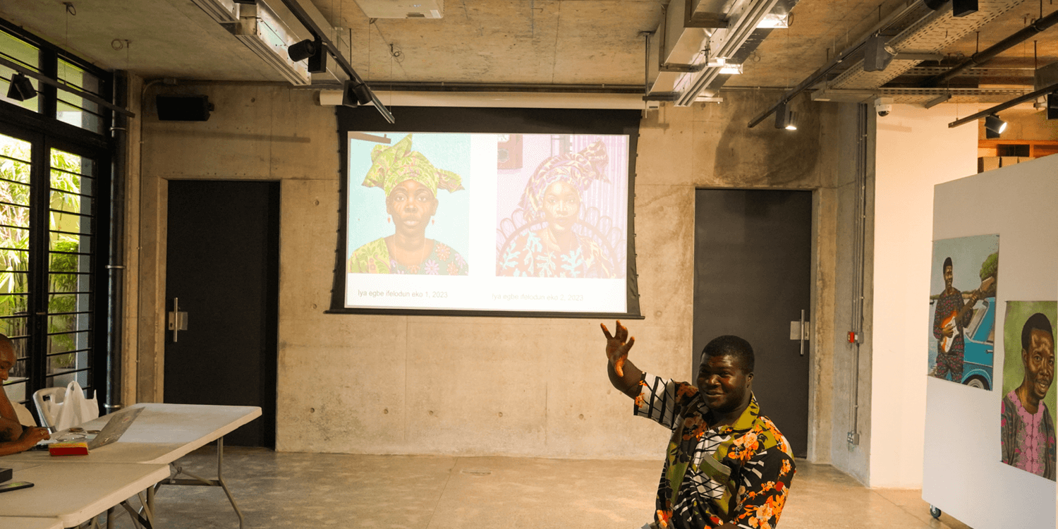 The event opened with a welcome address from Residency and Project Manager Adekunle Adeboye, who set the tone for the afternoon. Attendees introduced themselves and shared their backgrounds, creating an atmosphere of openness and collective engagement. Adewale then presented his artistic journey, tracing it from his early fascination with tracing images from books to his apprenticeship under David Olatoye, a Nigerian contemporary artist known for his hyper-stylised portraits rendered in acrylic and pen. Under Olatoye’s mentorship, Adewale began to refine his own visual language and discover his artistic focus.