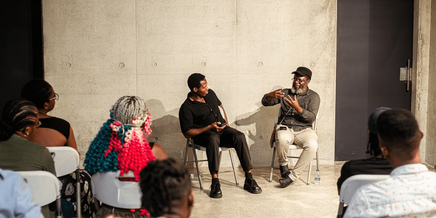Monangambee Curator Dara Omotoso (L) in conversation with G.A.S. resident Dr Tinashe Mushakavanhu (R).