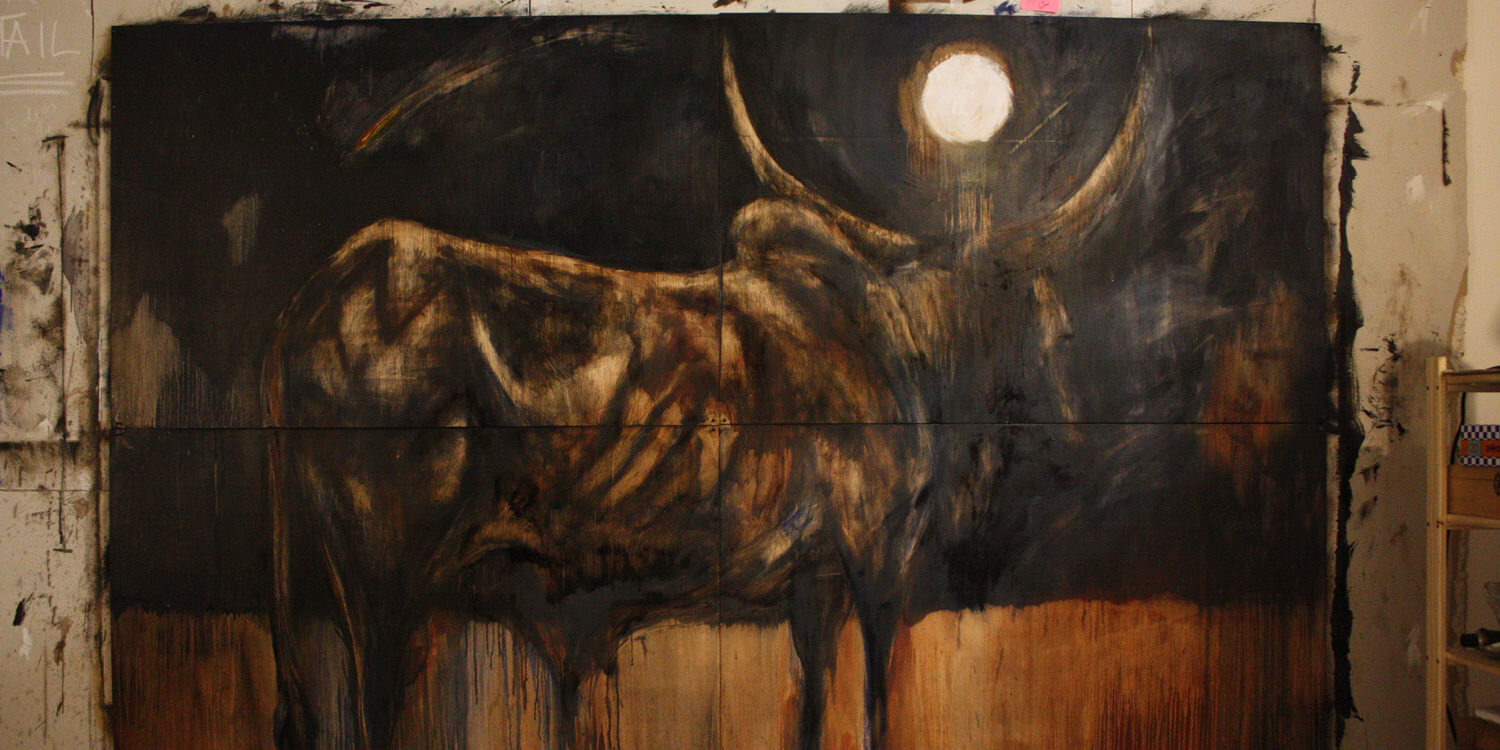 Rested between slumped shoulders held the moon in waiting, 2025, Oil paint, charcoal, chalk on plywood, 162 x 244 cm. Image courtesy of the artist.