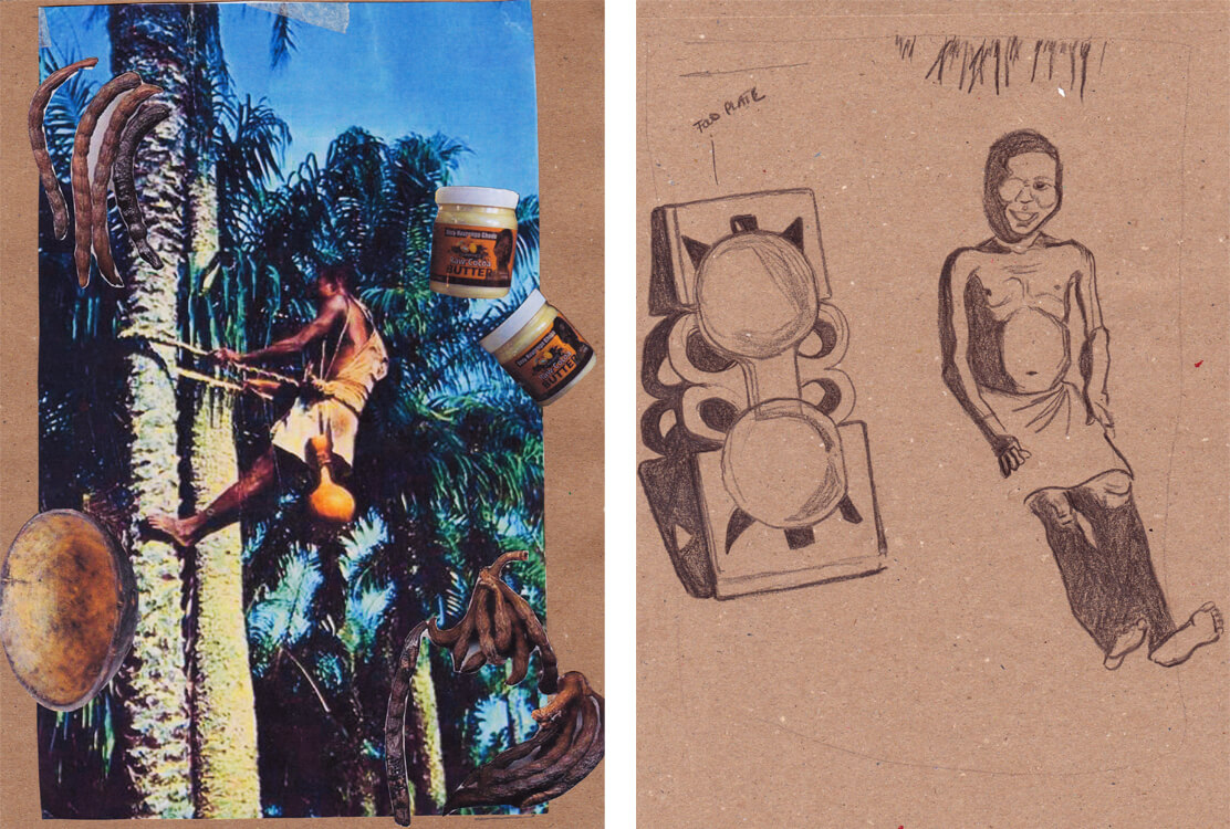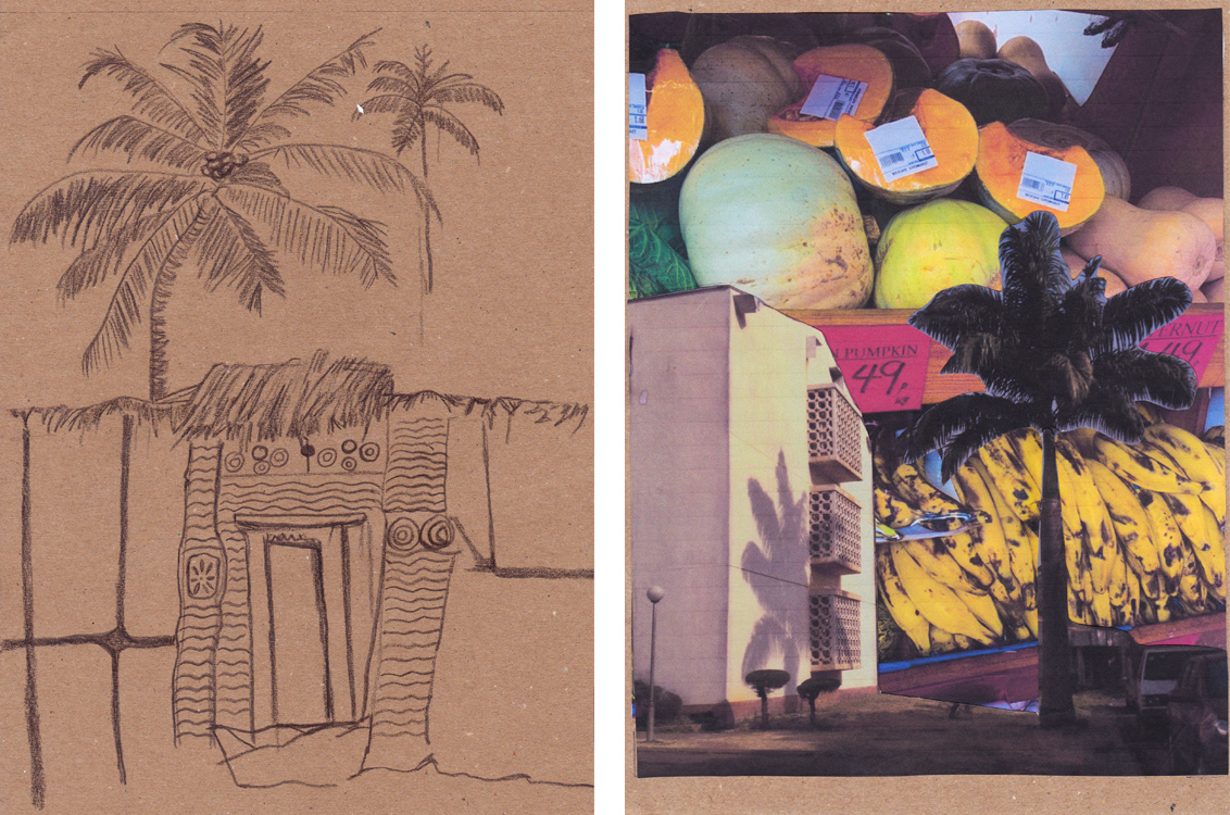 Untitled 02 (2022) Collage, paper on kraft paper (left). Afele Sketch Study 03 (2022). Coloured pencil on kraft paper (right).