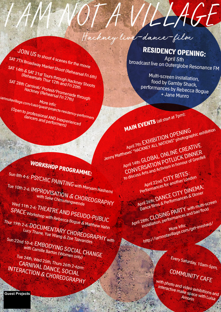 A month of dance, film, participation, workshops, performances, interventions, creative conversations, screenings and happenings leading to the creation of a participatory live dance film. Local Artists and community activists, as soul restoration and last ditch lateral response to the intense gentrification of the area that lost us our local café, the west Indian fish and veg shop and finally our own homes and work spaces; inverse-propaganda against consistent denigration of the vitality and value of multi-social-culturalism and community.