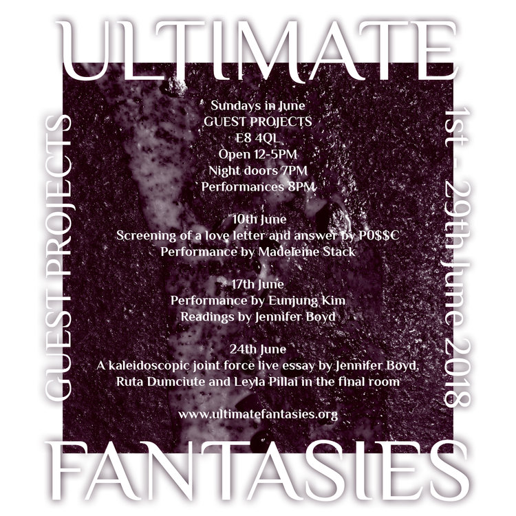 Ultimate Fantasies is a project exploring the force of desire by Jennifer Boyd and Ruta Dumciute, and collaborators Leyla Pillai, Eunjung Kim, Madeleine Stack and P0$$€.