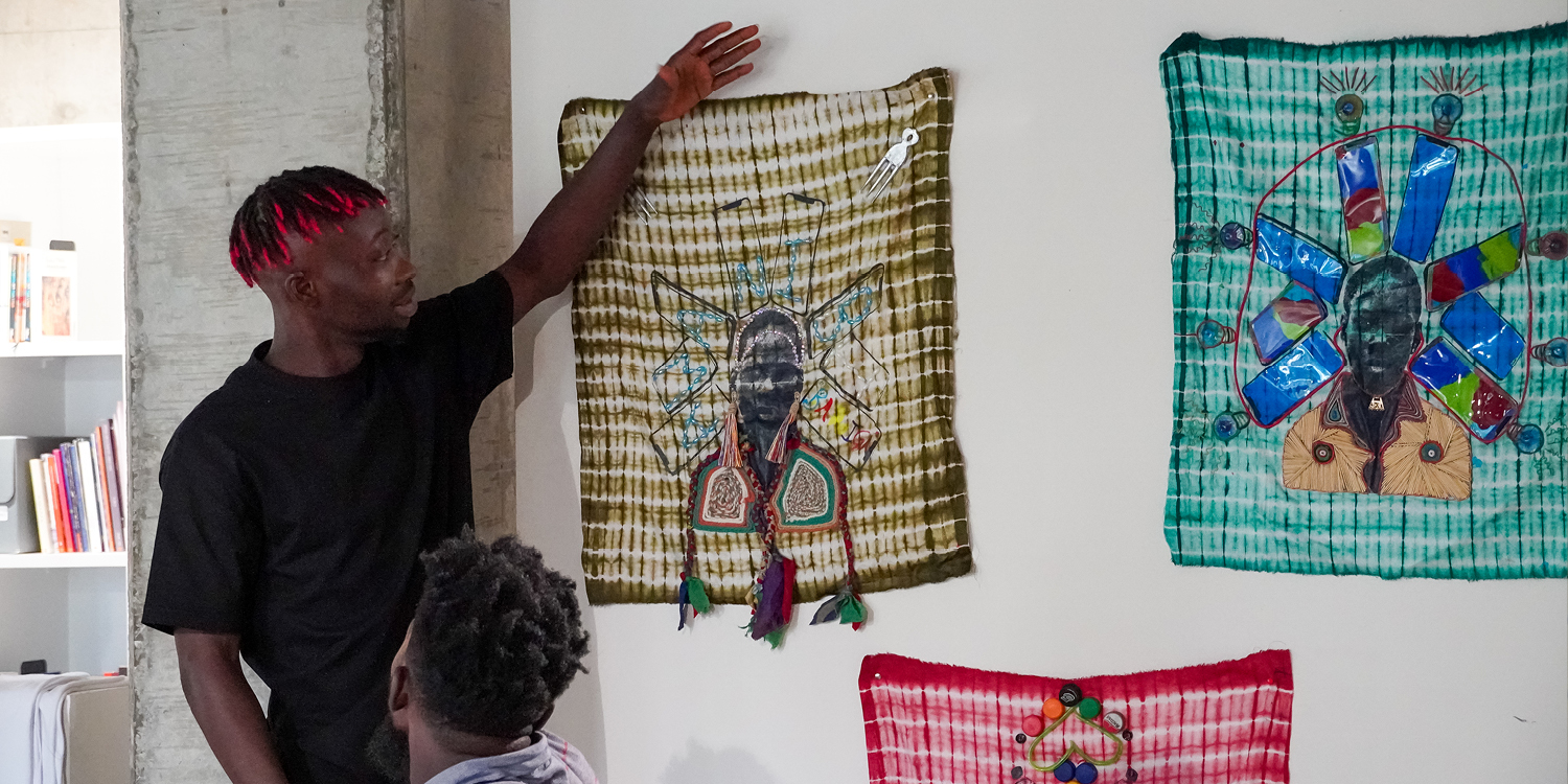 To conclude his residency Rafael hosted a series of circular fashion workshops. The first was held offsite in Bariga, a community characterised by adjacent landfills that provide inhabitants with building materials and income streams through recycling. Rafael collaborated with Peter D. Abayomi of the Eran Jije Project, whose work activates the Bariga community through music, dance, and environmental awareness activations. Together they lead a session with 15 young people centred around learning embroidery, applique, and weaving techniques and experimentally applying them along with other waste materials to pre-made printed textiles and banners. The workshop was repeated at G.A.S. Lagos with a cohort of local fashion, textiles, and crafts practitioners.