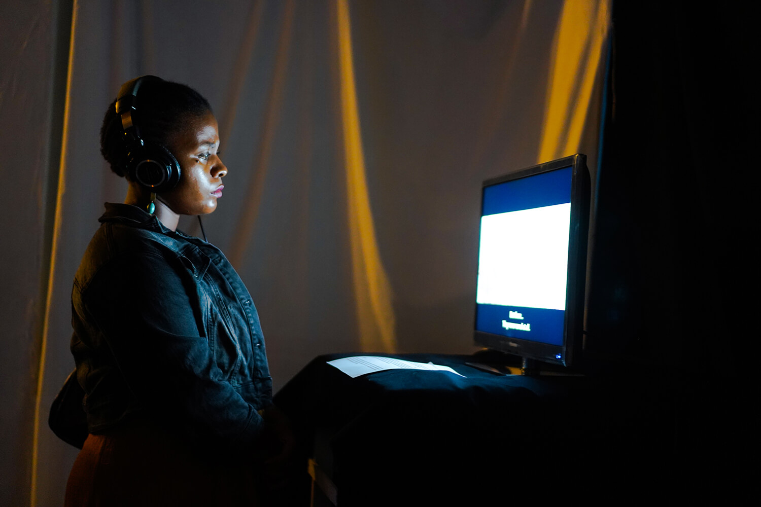 Dijay Blaki contributes a performative narration and live dubbing of Christopher Nolan’s 2020 science fiction thriller Tenet. The artist, who belongs to a large subculture of performative translators in the city known as 'djs', merges traditional dubbing techniques with live performance elements, creating an enriched viewing experience that reinterprets the original film’s narrative. Dijay Blaki has translated over 50,000 films into colloquial Swahili and a handful into regional dialects.