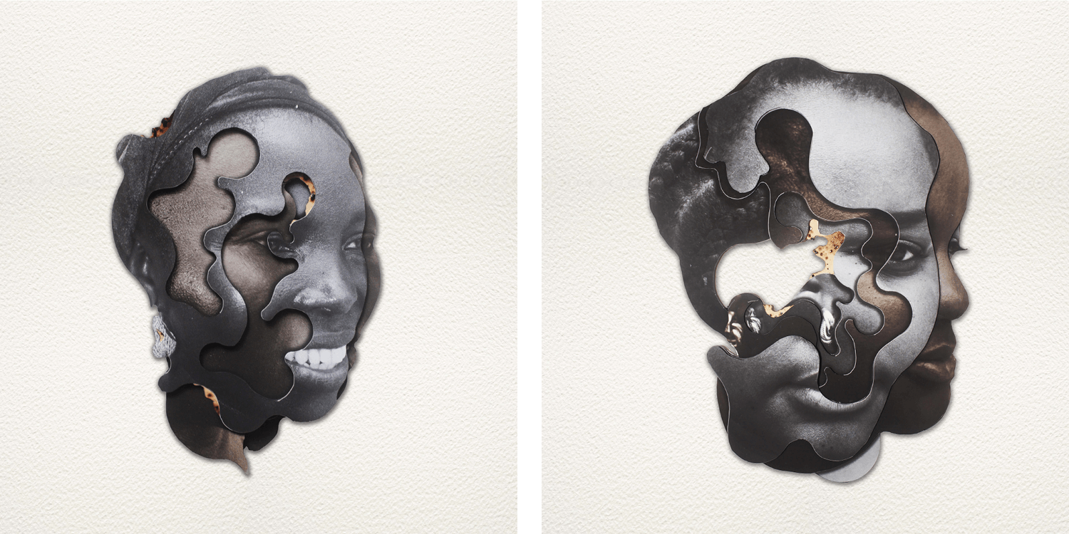 In Portraits, Mobolaji creates multi-layer collages, incorporating a process of burning and cutting to create depth in revealing underlying layers of images. In 2022 -2023, she developed the 'Portraits' series, where she delved into incorporating coffee granules as an important element within each portrait. Mobolaji expanded on these explorations during a 5-week residency at The Noldor Residency in Accra, Ghana, in 2022. She is currently exploring the use of transparent materials as tools for collage.